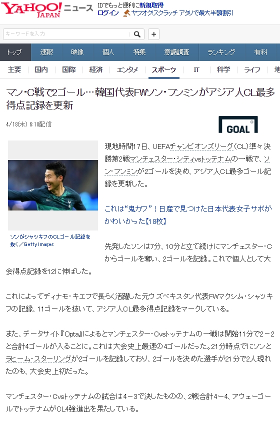 日 언론 "손흥민, 아시아선수 챔스 최다골 기록 경신" 일본반응
