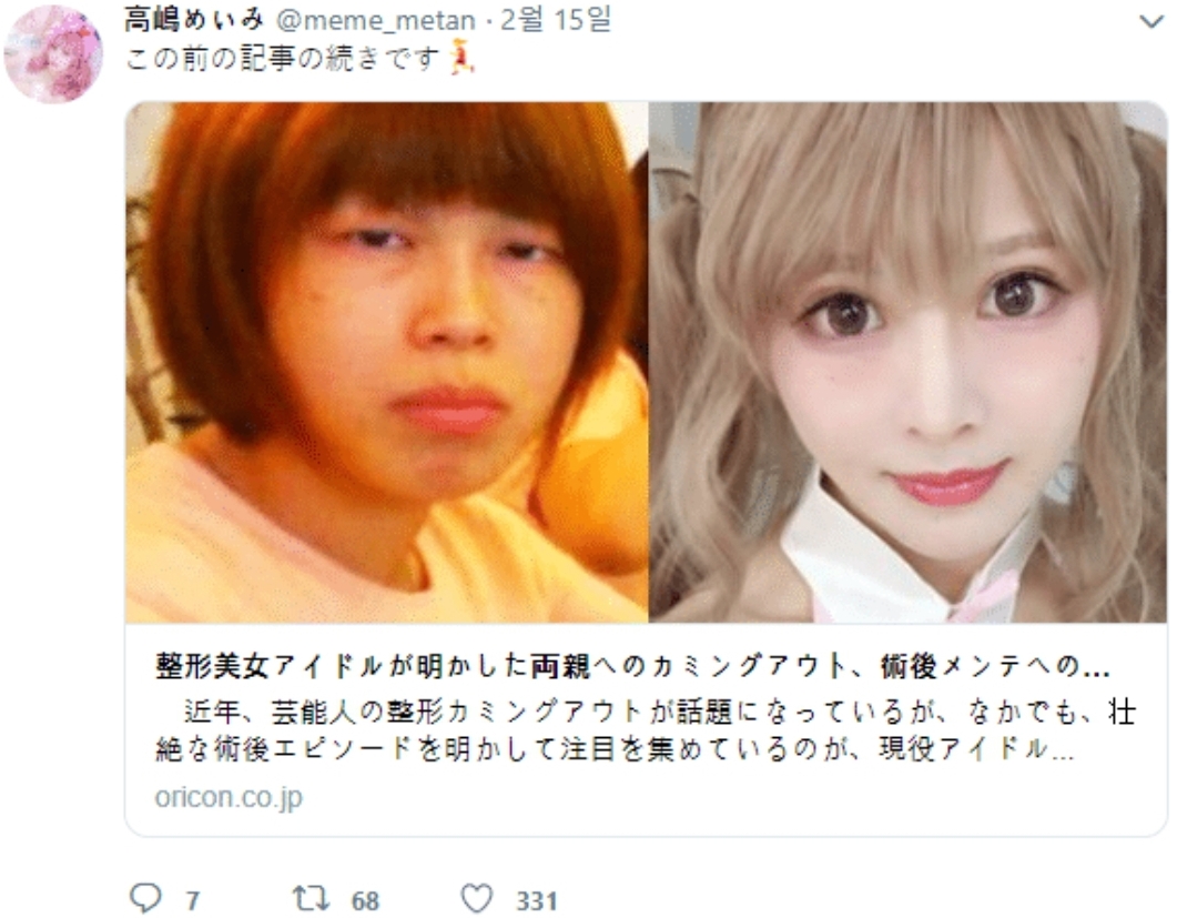참고로 시술받은 성형외과가 " 후카다 에이미 " 가 시술받은곳과 같은 곳이라고